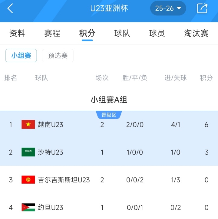 在小组积分榜上,越南U23两战全胜,暂居小组第一名,已经占据了出线主动权。