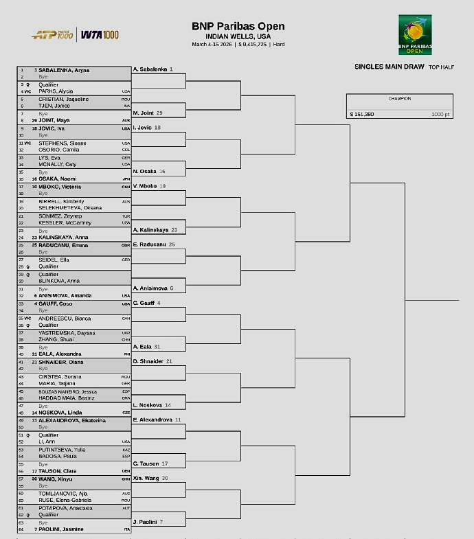 中国二姐王欣瑜同样首轮轮空,次轮对手将在澳洲人汤姆贾诺维奇和罗马尼亚人鲁塞之间产生,如能晋级或将挑战意大利小钢炮鲍里妮;中国老将张帅首轮迎战乌克兰人雅斯特雷姆斯卡,如果获胜,将在次轮对阵菲律宾一姐伊埃拉。祝金花们好运!